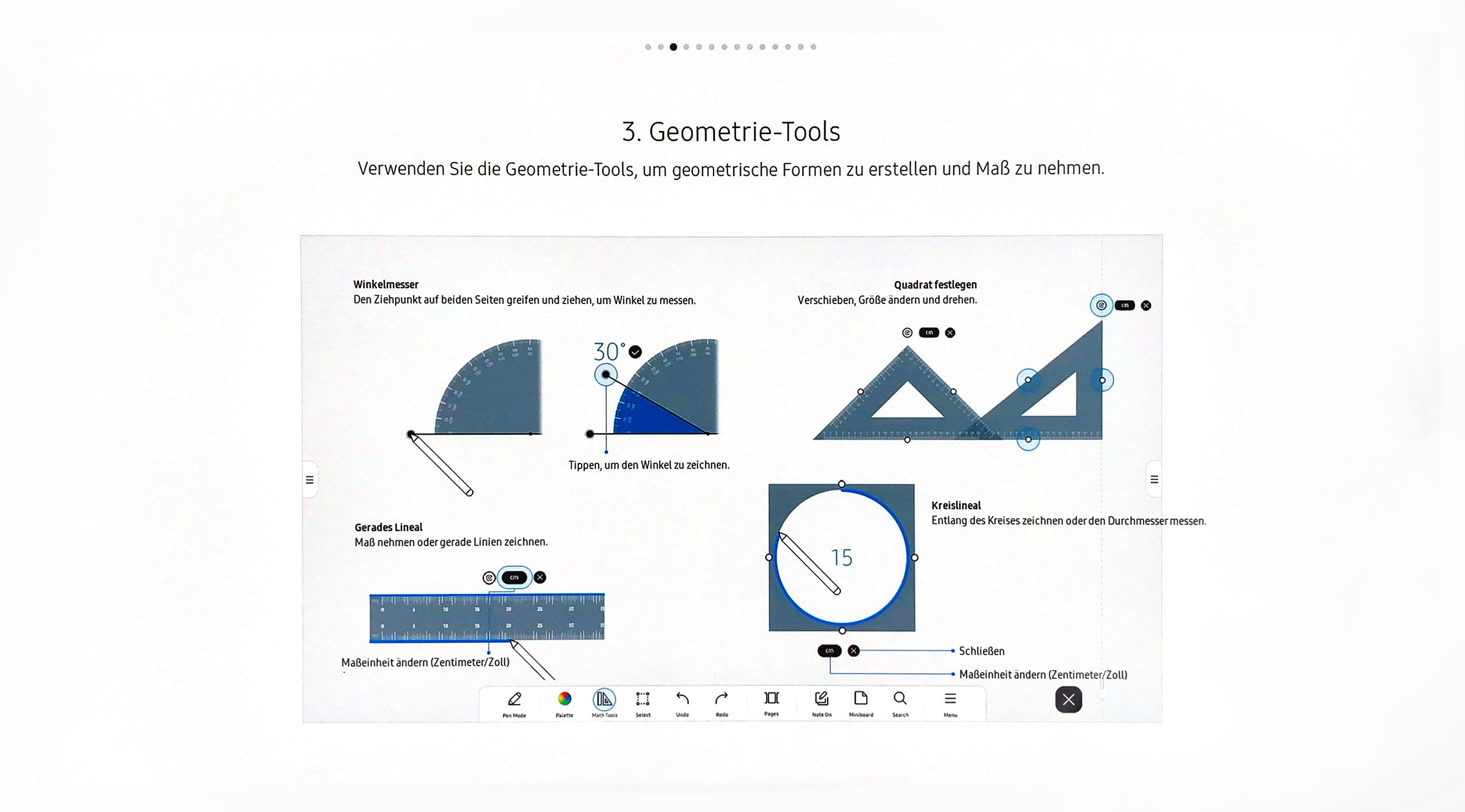 Verwenden Sie die Geometrie-Tools, um Formen zu zeichnen und Messungen vorzunehmen. Die einzelnen Elemente können in der Größe angepasst und frei gedreht werden.