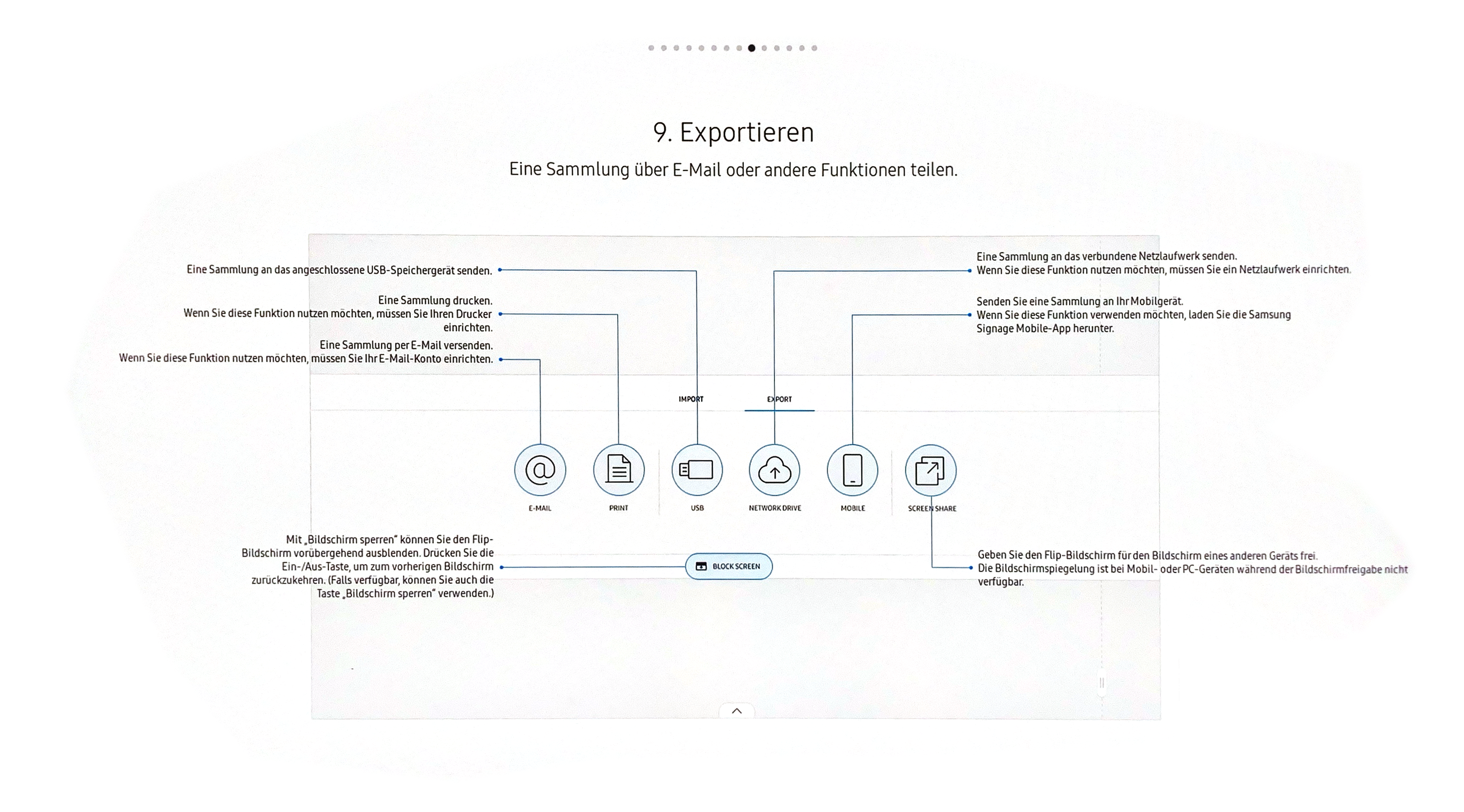 Über das Burger Menü am linken und rechten Bildschirmrand (drei Striche übereinander) können Sie Inhalte importieren und exportieren. Dateien lassen sich über angeschlossene Geräte oder – falls das Gerät mit dem Internet verbunden ist – über das Internet importieren. Mit der Funktion „Block Screen“ können Sie den Bildschirm sperren, und über den Ein-/Aus-Knopf wird der Bildschirm wieder eingeschaltet.