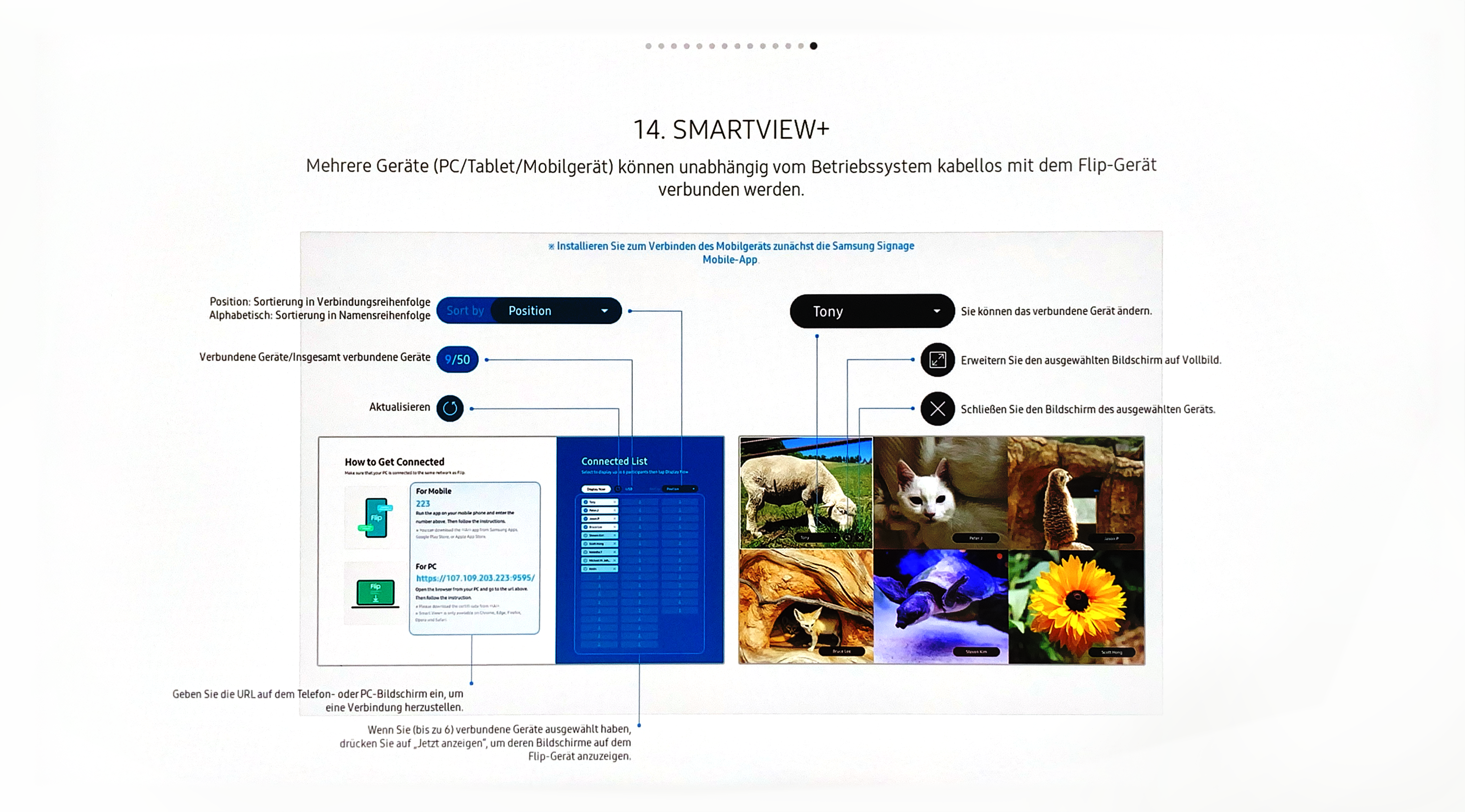 Mit Smartview+ können mehrere Geräte wie PC, Tablet oder Mobilgerät unabhängig vom Betriebssystem kabellos mit dem Flip-Gerät verbunden werden. Voraussetzung dafür ist die Installation der entsprechenden App auf dem zu verbindenden Gerät.